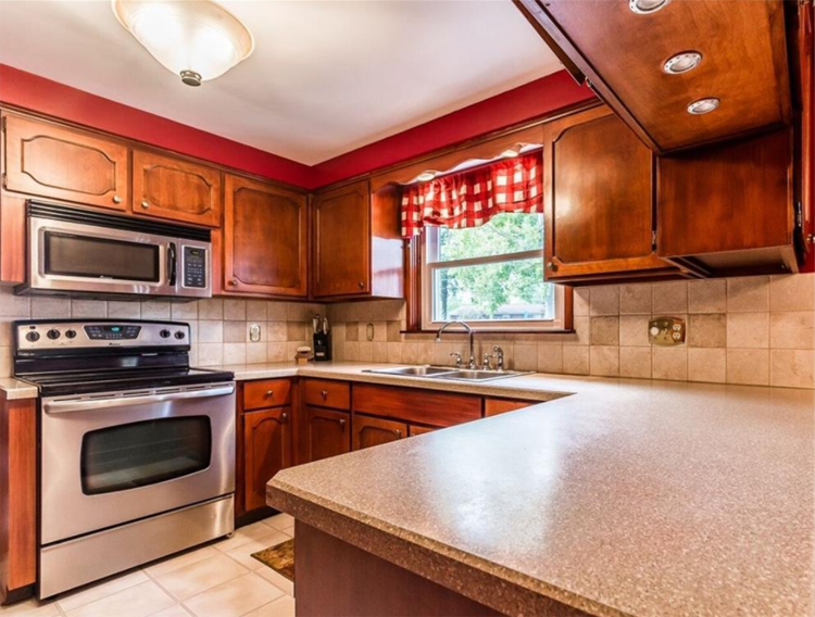 The vibrant warm cabinetry in this home is enough to draw anyone in, but you'll also be drawn to the striking black appliances and the grey backsplash. Mixing colors and materials works well in this kitchen! The same elegance found here can be found throughout the four-bedroom home.A Rustic Country Vibe