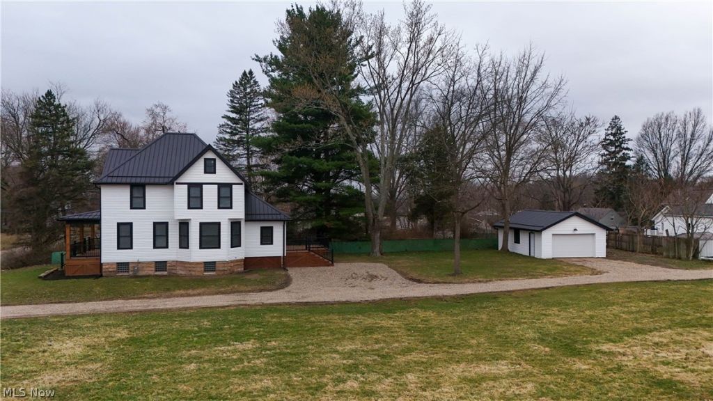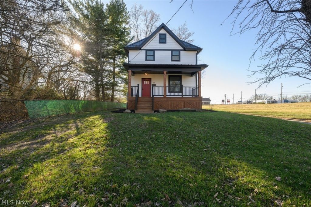 Beautifully restored 1903 Massillon farmhouse! Stunning exterior with new siding windows, exterior doors and a steel roof! Inviting covered front porch opens to a stunning foyer with decorative tile, turned hardwood staircase and pocket doors opening to the living room! The first floor features 9 foot ceilings, one foot deep baseboards, LVT floors and tons of natural light! Stunning custom kitchen with slow closed drawers, quartz countertops, tile backsplash, undercabinet lighting, stainless appliances and display cabinetry! The kitchen opens to a massive formal dining area with bayed windows. Thoughtful full bath on the main level as well as a mudroom with exposed wood walls. The mudroom leads to a 14 x 11 trex deck overlooking the backyard and oversized two car garage. The second floor has three bedrooms with ceiling fans, carpet and new fixtures. Stunning full bath with oversized tiles, walk-in tiled shower and double sinks with granite countertops. There is a convenient 2nd floor laundry room closet and a massive attic! Full basement with massive stone walls maintains the original aesthetic with the addition of oversized glass block, windows and black painted ceiling with recessed lights. New furnace, AC and water tank. This home has a rare blend of authentic charm and contemporary luxury! Absolute showstopper!